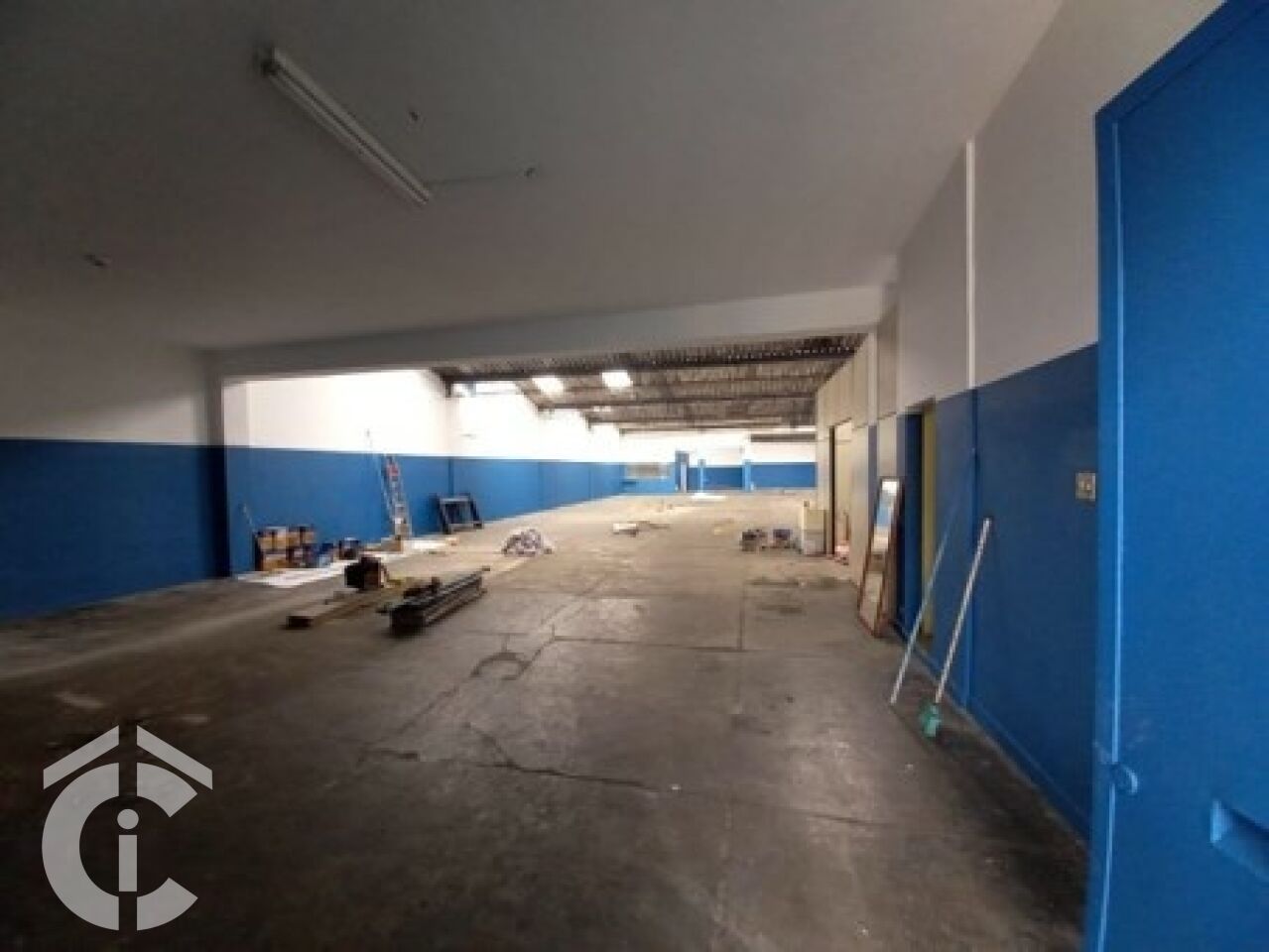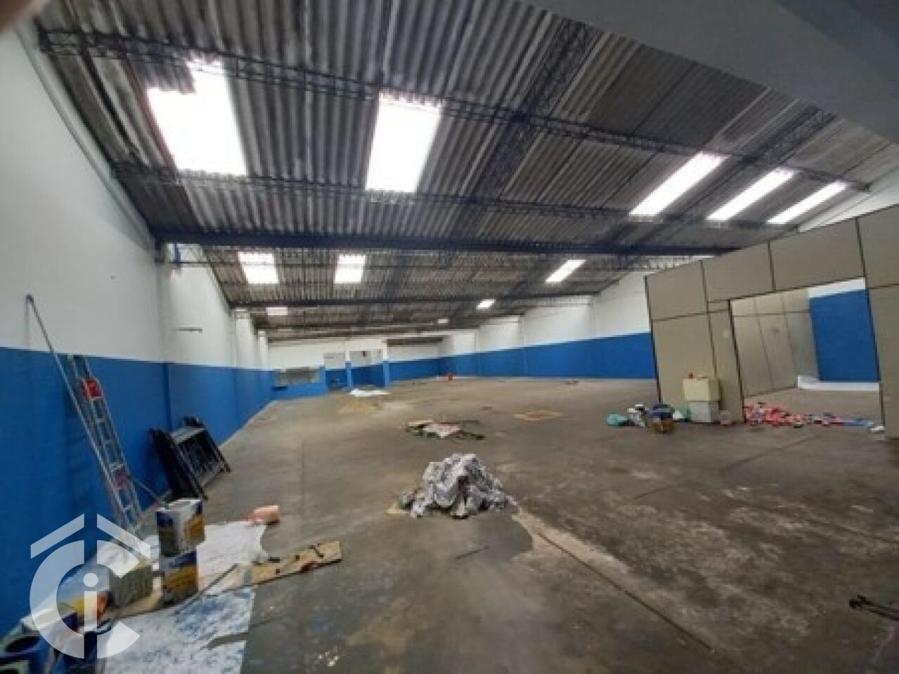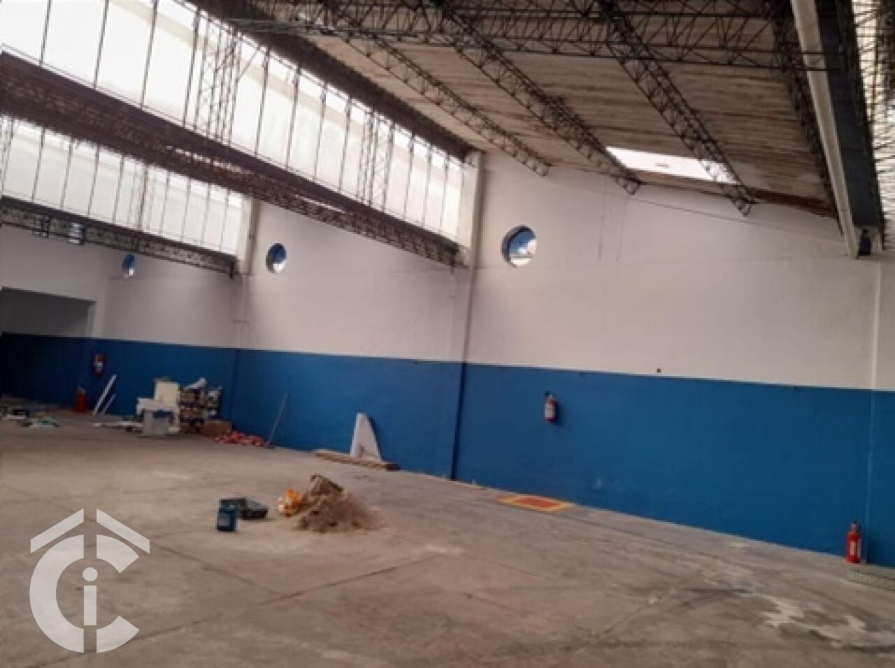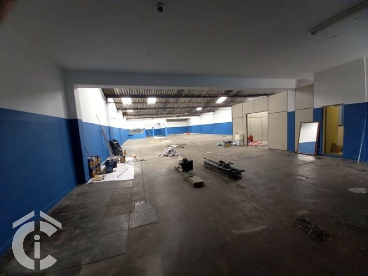 São 20 m só de frente, entrada para caminhão, pé direito alto, corredor lateral, 5 salas para administrativo, 4 banheiros.