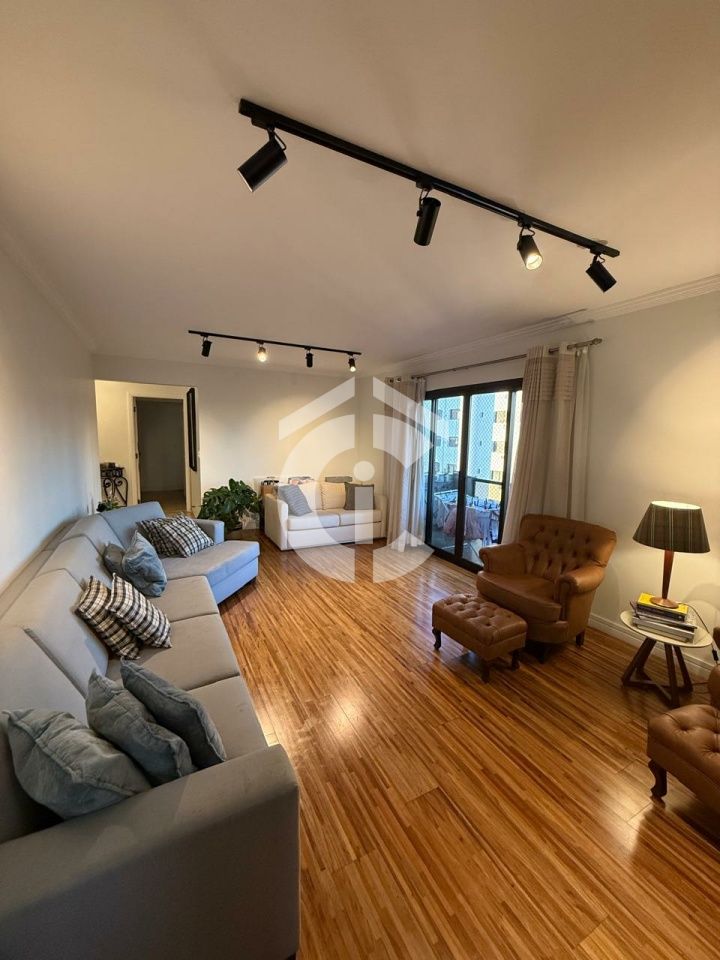 Living Amplo para 3 Ambientes: Sala de estar e TV com iluminação projetada em spots de trilho, piso em madeira nobre e integração com uma charmosa varanda, proporcionando excelente iluminação natural.